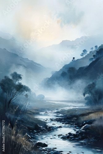 Fototapeta premium a layered lines, misty atmosphere, soft color fields, watercolorist