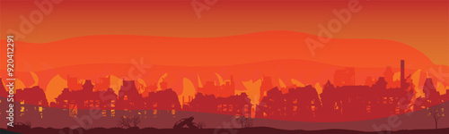 © Евгений Соловьев, Naklejka premium A leader in a destroyed city. the war destroyed the settlement. Panorama. Vector