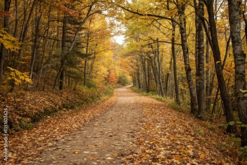 Obraz premium A leaf-covered pathway winds through the vibrant fall foliage of the golden...
