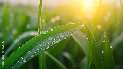 Naklejka premium A leaf is covered in raindrops, and the sun is shining through the leaves