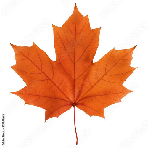 © siaminka, Obraz premium A leaf of a tree is shown in full color. The leaf is orange and has a pointed tip.