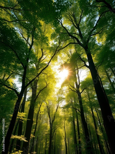 Naklejka premium A leafy green forest canopy with sunlight filtering through, earthy tones,...