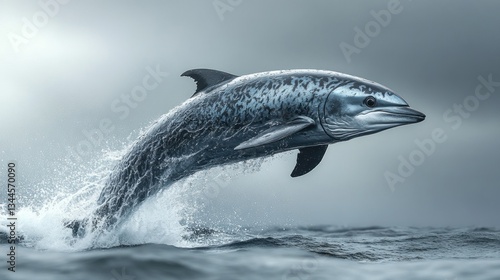 © dewi, Obraz premium A leaping dolphin in a misty sea. Powerful marine mammal gracefully emerging from the ocean waves