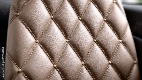 © Nataliia_Trushchenko, Fototapeta premium A leather seat with a diamond pattern and gold studs. The seat is brown and has a shiny appearance