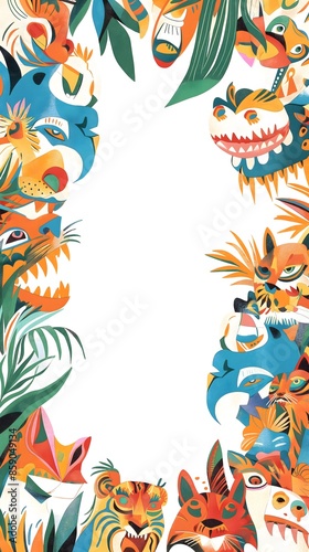 © GreenOptix, Obraz premium A Left and Right made of various Tiger heads, Tigers And Jungle Plants, space for text, ornament