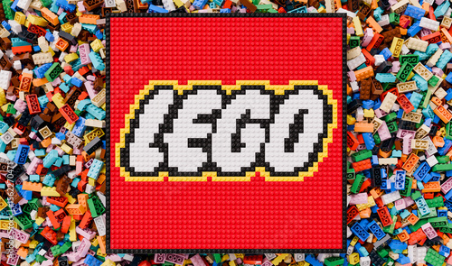 © Torpix, Obraz premium A LEGO Logo, Built with Bricks, on a Pile of Assorted Bricks
