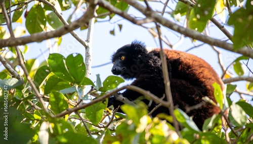 Fototapeta premium A lemur, dark brown and black furred, perches high in a lush tropical tree canopy.