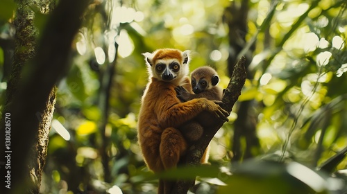 Fototapeta premium A lemur holds its baby tightly in the dense rainforest, emphasizing their...