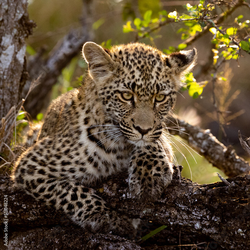 © Jurgens, Fototapeta premium a leopard cub resting on a dead tree in golden light