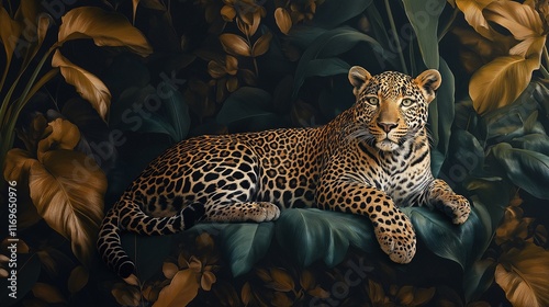 © visart, Naklejka premium A leopard is laying on a green leafy surface