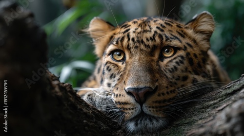© RiaNur, Fototapeta premium A leopard lounging on a tree branch
