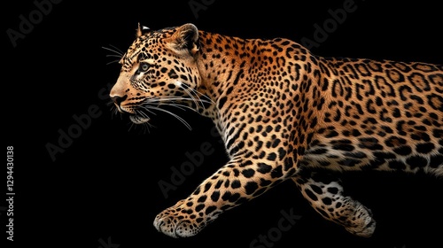 © Boonnam Burart, Naklejka premium A leopard's muscular form crouching, preparing to pounce against a pitch-black backdrop