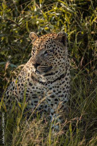 © Anna, Obraz premium A leopard sitting in the long grass looking into the distance, Greater Kruger.