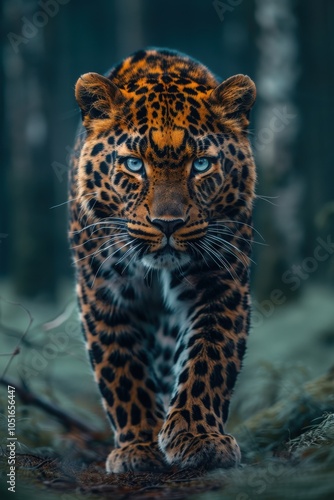 © Robert Anto, Naklejka premium A leopard walks forward in the dense jungle, highlighting its powerful stance and captivating gaze amidst the wild greenery.