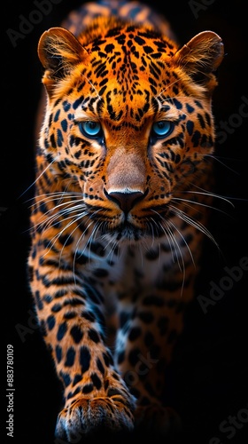 © VISUAL BACKGROUND, Obraz premium A leopard with blue eyes is walking in the dark.