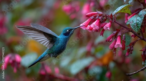 © VolumeThings, Fototapeta premium A lesser violetear hummingbird foraging on coleus flowers in a central Colombian forest near Villa de Leyva during the afternoon