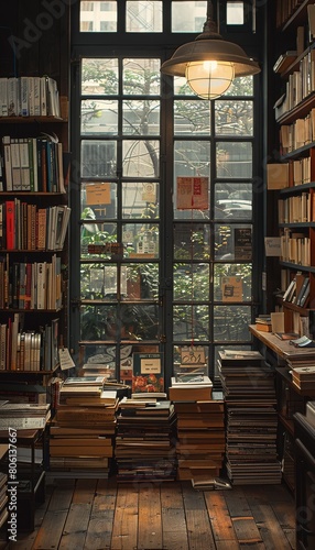 Fototapeta premium A libraly with bookshelves and a large window