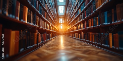 Fototapeta premium A library aisle filled with bookshelves, creating a tunnel of knowledge, bathed in warm sunlight