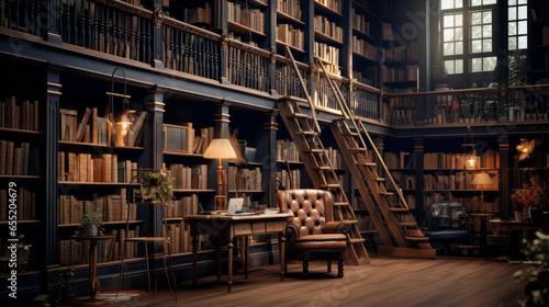 Obraz premium A library with floor-to-ceiling bookshelves, a ladder, and a cozy reading corner