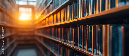 Fototapeta premium A library with many bookshelves and a sun shining through the windows
