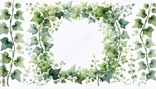 Fototapeta premium A light and airy watercolor illustration of a rectangular frame made of delicate green ivy leaves and vines