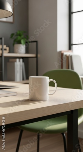 Obraz premium A light beige wooden desk, featuring a plain white mug, sits in a modern,...