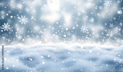 Fototapeta premium A light blue background with snowflakes falling, creating an atmosphere of winter and frosty beauty. The background is a soft gradient from top to bottom in shades of white, blue, and gray.