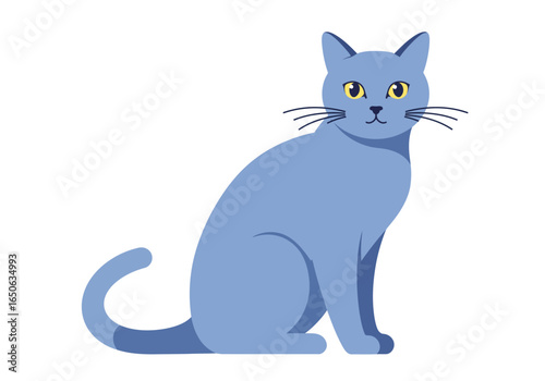 Obraz premium A light blue cat with yellow eyes sits facing forward with a curled tail and...