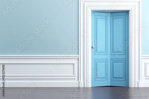 Fototapeta premium A light blue double door in a pale blue room with white wainscoting and dark...