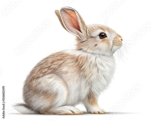 © jamal, Obraz premium A light brown and white rabbit sitting upright with its ears perked up on a white background