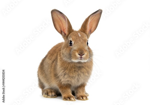 © Muaz, Fototapeta premium A light brown bunny with long ears sitting upright on a white background looking at the viewer
