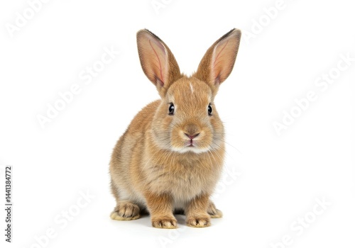 © Muaz, Obraz premium A light brown rabbit with long ears sitting upright against a stark white background in a studio shot