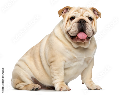 Obraz premium A light colored bulldog sitting with its tongue out on a white background in...