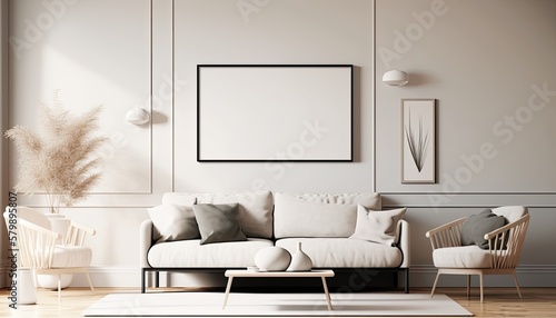 Fototapeta premium a light cream white Scandinavian, boho-themed living room interior background with a horizontal frame mockup, Japandi, 3D rendered, contemporary-themed, modern interior mockup. Generative AI