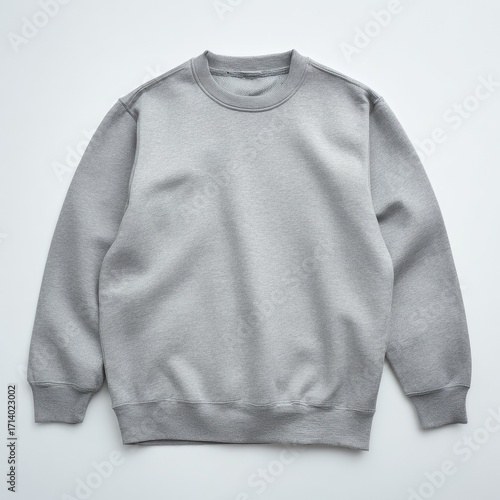 © Bintang, Fototapeta premium A light gray, plain, crew-neck sweatshirt laid flat on a white surface