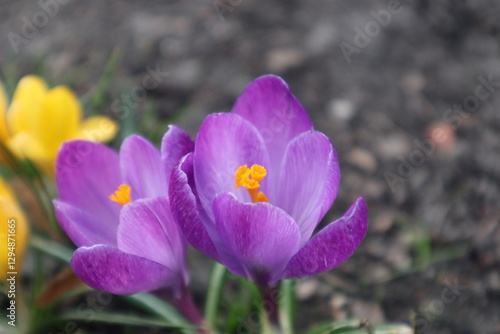 Fototapeta premium A light purple flowers with a bright yellow center grows from the ground...