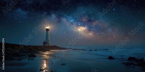 © Rahmat, Fototapeta premium A lighthouse bathed in light stands on a rocky coastline, illuminated by the starry Milky Way