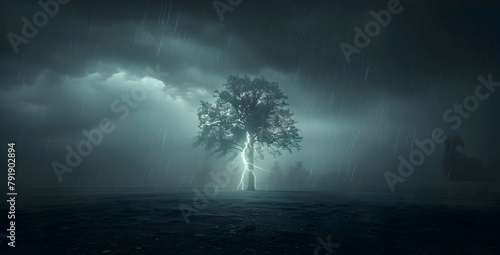 Fototapeta premium A lightning bolt striking a lone tree on a plain, using HDR to capture the...