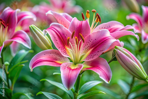 Fototapeta premium A lily with thin, feather-like petals in bright pink and soft green hues