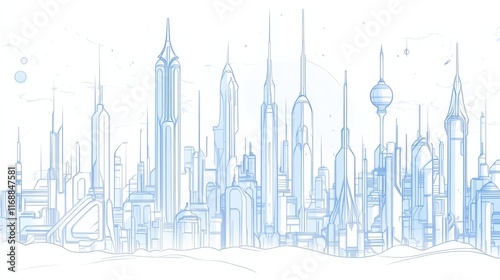 © Thanaporn, Naklejka premium A line drawing of a futuristic cityscape with towering spires