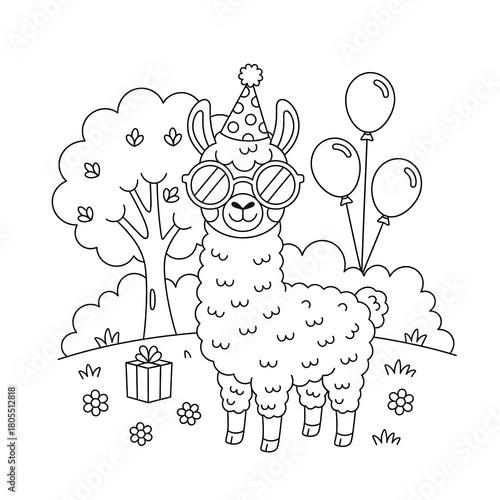 © SetCartoon, Obraz premium A line drawing of a llama wearing a party hat and sunglasses with balloons and a gift