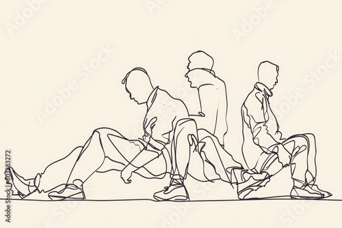 Obraz premium A line drawing of three people sitting on a bench. Suitable for various concepts