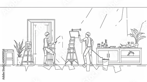 Fototapeta premium A line drawing of two painters working on an apartment wall. One painter is...
