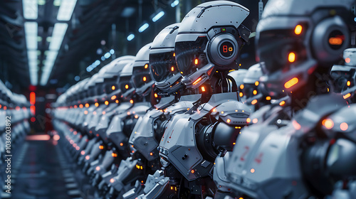 © Elnare, Fototapeta premium A line of futuristic robots stand in a factory setting.