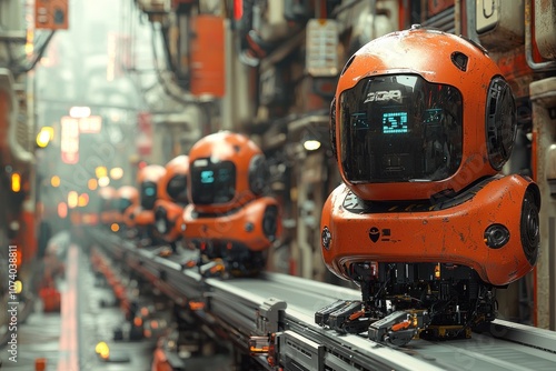 Fototapeta premium A Line of Orange Robots Moving on a Conveyor Belt in a Futuristic Cityscape