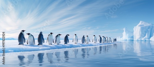 © naila mutmainah, Obraz premium A Line of Penguins on a Snowy Ice Shelf in Antarctica