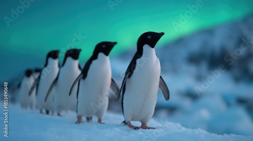Obraz premium A line of penguins walks across the snow, illuminated by a stunning aurora...