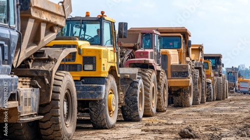 © Dara, Obraz premium A lineup of various heavy equipment vehicles in a construction yard.
