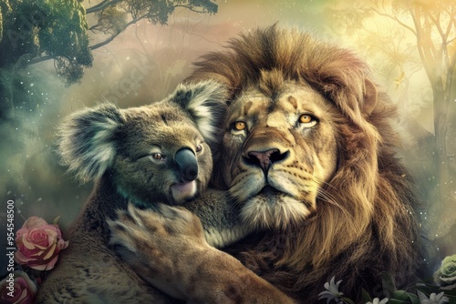© Surachetsh, Naklejka premium a lion and a koala in a cozy embrace, highlighting the gentle side of these wild animals. Great for storybooks and family-friendly art.