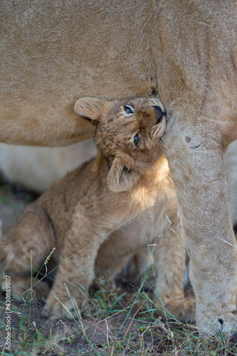 Naklejka premium A lion cub biting its mother on a safari in South Africa